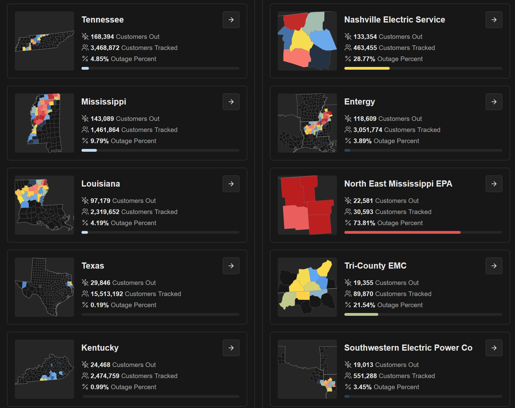 Winter Storm Fern left millions without power from Eastern Texas to Tennessee, with significant impacts over Northern Louisiana and across Mississippi. Nashville's Davidson County saw 195k outages on Sunday, with more than 100k remaining by Thursday.