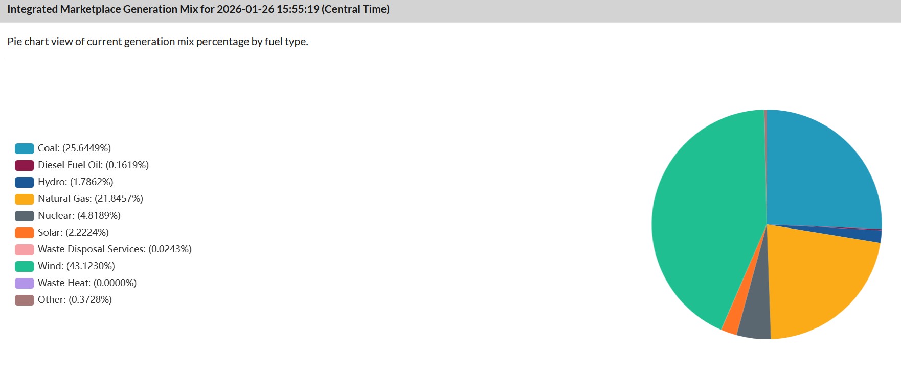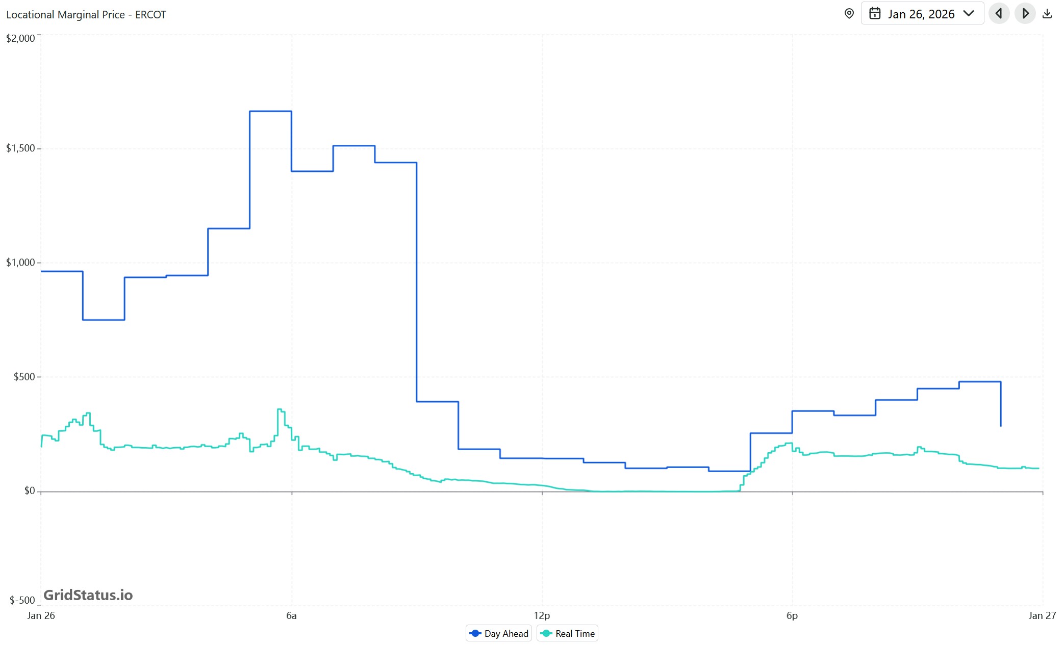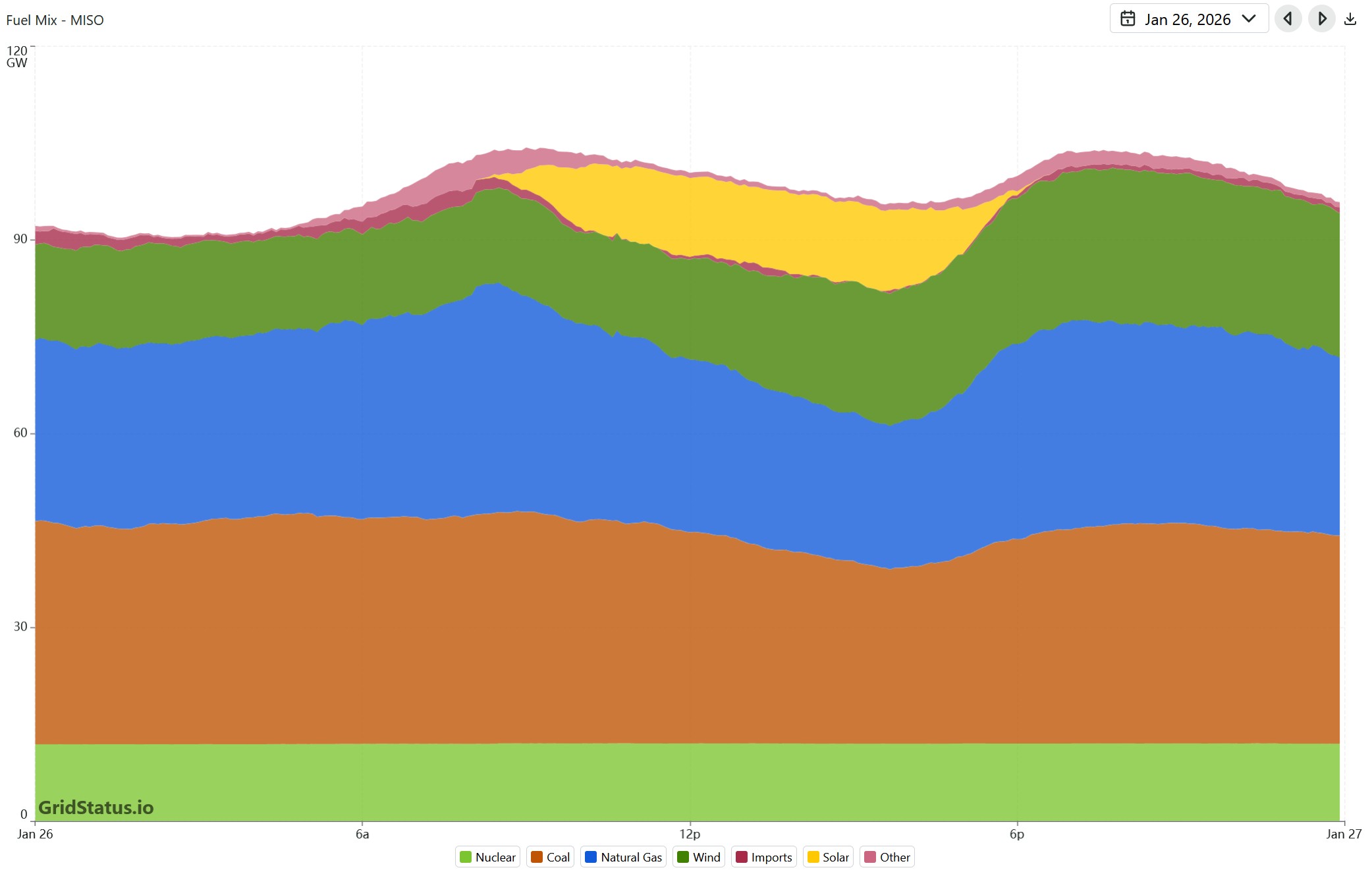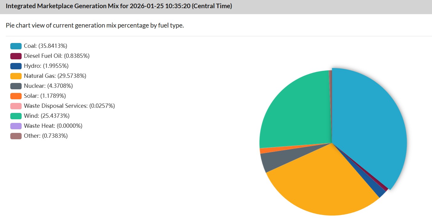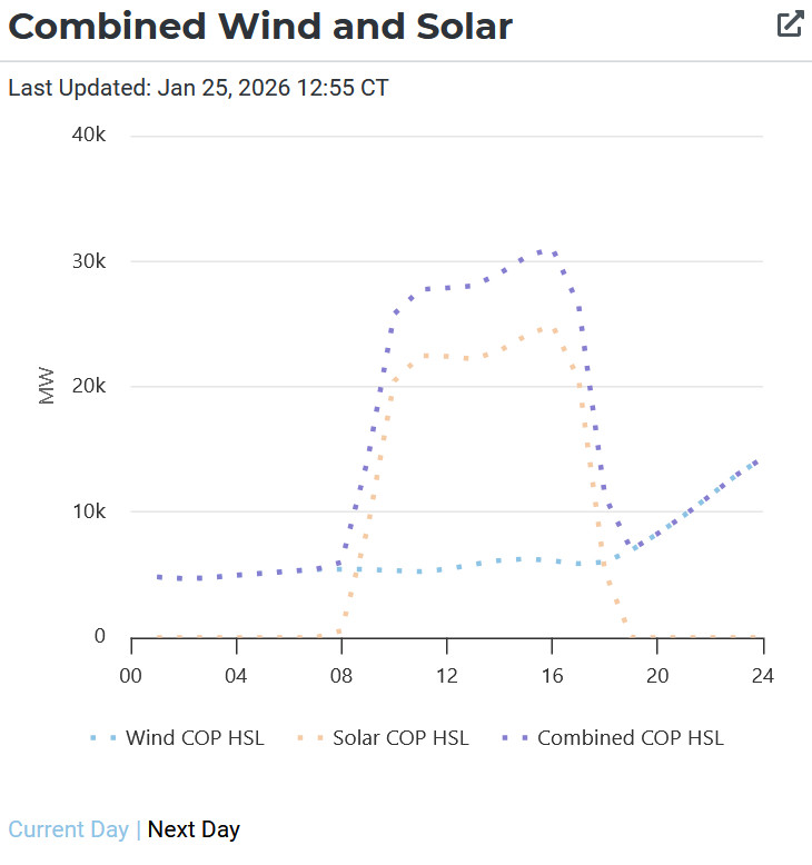 Source: GridStatus.io indicates on January 26 about 1% more solar than natural gas serving demand from noon-3pmET, with almost 10% of demand being served in the morning by energy storage. Wholesale prices remained between $144/MWh at 8am to $-1.99/MWh at 4pmET. <click to enlarge>