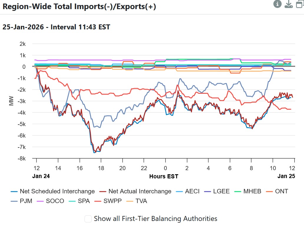 Notably, on January 25 when wind and solar were a modest portion of the energy mix in MISO, imports from SPP of up to almost 3 GW’s helped to keep prices low in MISO’s western footprint. It was also clear that at moments of need overnight on January 25 that imports of a little over 7 GW’s from PJM and SPP were critical to maintaining reliability in MISO North during the EEA2.
